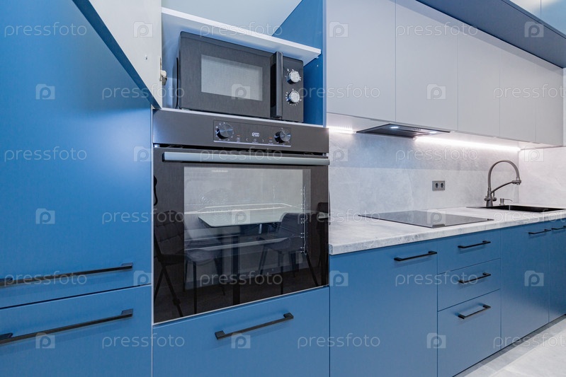 Встроенная духовка и микроволновая печь в современной сине-серой кухне