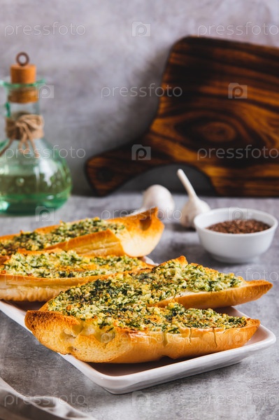 Печеный багет с маслом, чесноком и укропом на тарелке на столе вертикальный вид