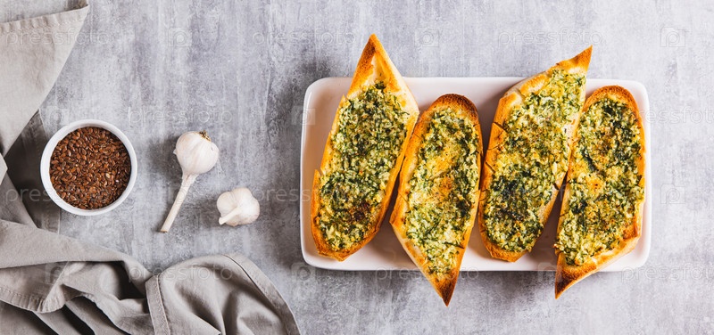 Золотой чесночный хлеб с травами на тарелке На столе с веб-банером просмотр