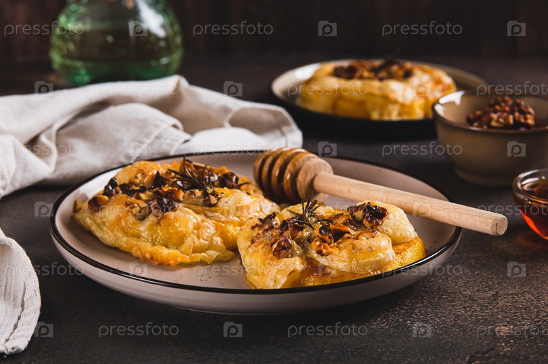 Выпеченная тыква с сыром бри, орехами, розмарином и медом на тарелке на столе