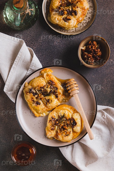 Тыква, сыр, орехи и розмарин выпечены с медом на верхней части тарелки и вертикальный вид