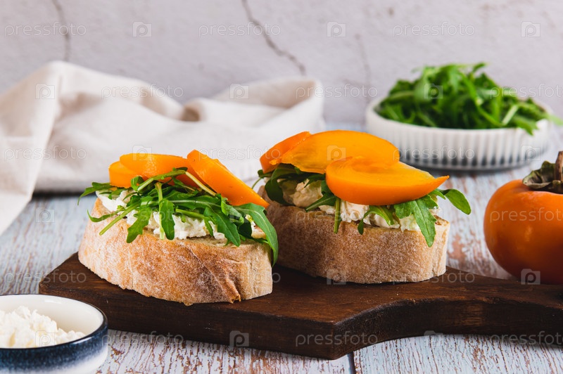 Персимон, рукула и сливочный сыр на киабатте на деревянной доске на столе