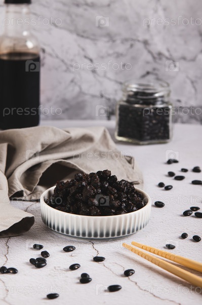 Ферментированные черные бобы дучи в миске на столе с вертикальным видом