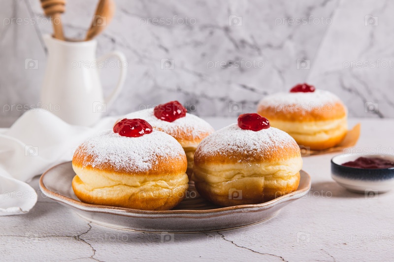 Сладкие пончики в сахарном порошке с варенем на тарелке за столом