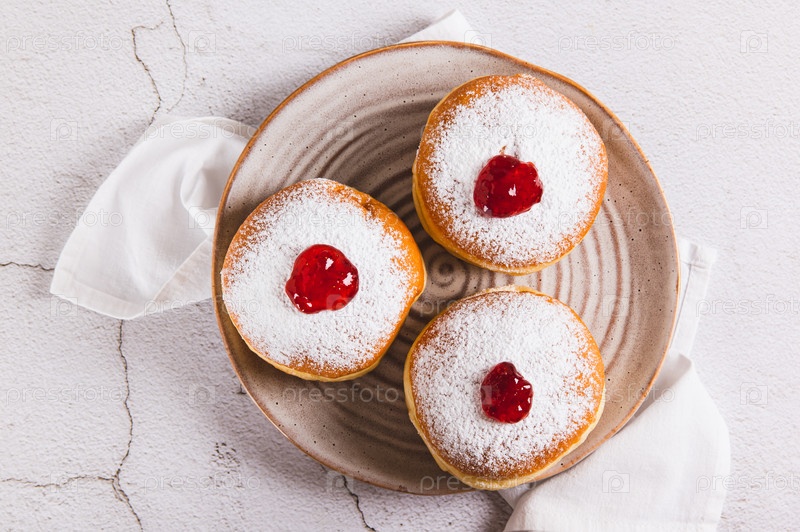Сладкие пончики в сахарном порошке с варенем на тарелке, выходящей из-за стола