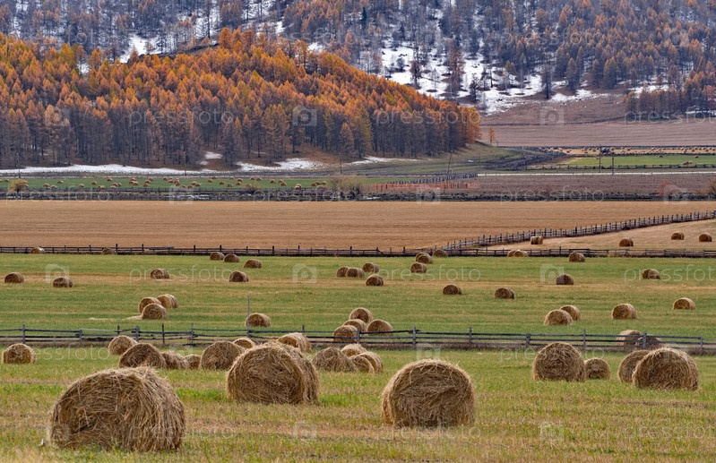 Юг Западной Сибири, Алтайские горы. живописный вид на склонистое поле с рулонами сена, собранными для зимы на фоне заснеженных гор и осенних личин