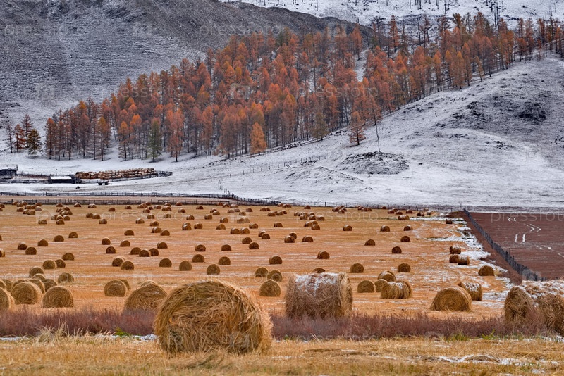 Юг Западной Сибири, Алтайские горы. живописный вид на склонистое поле с рулонами сена, собранными для зимы на фоне заснеженных гор и осенних личин