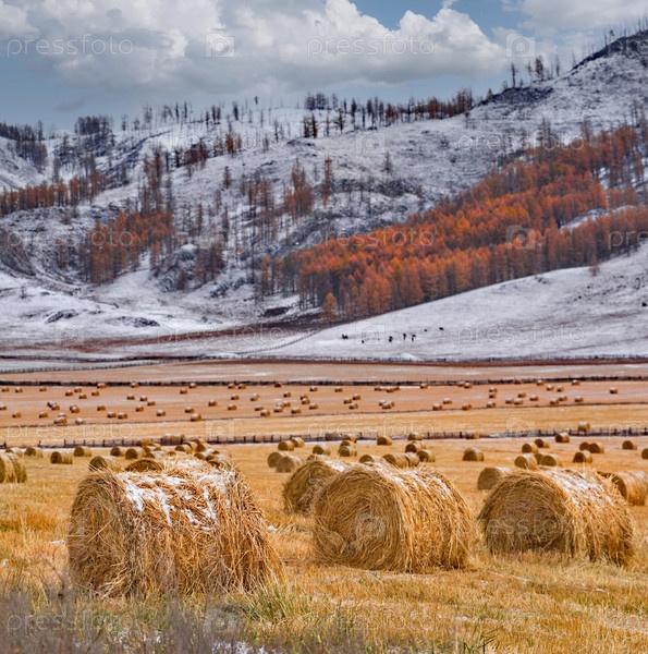Юг Западной Сибири, Алтайские горы. живописный вид на склонистое поле с рулонами сена, собранными для зимы на фоне заснеженных гор и осенних личин