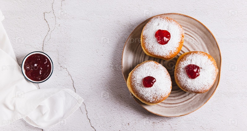 пончики с сахарным порошком на тарелке на столе