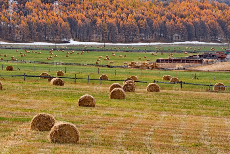 Юг Западной Сибири, Алтайские горы. живописный вид на склонистое поле с рулонами сена, собранными для зимы на фоне заснеженных гор и осенних личин