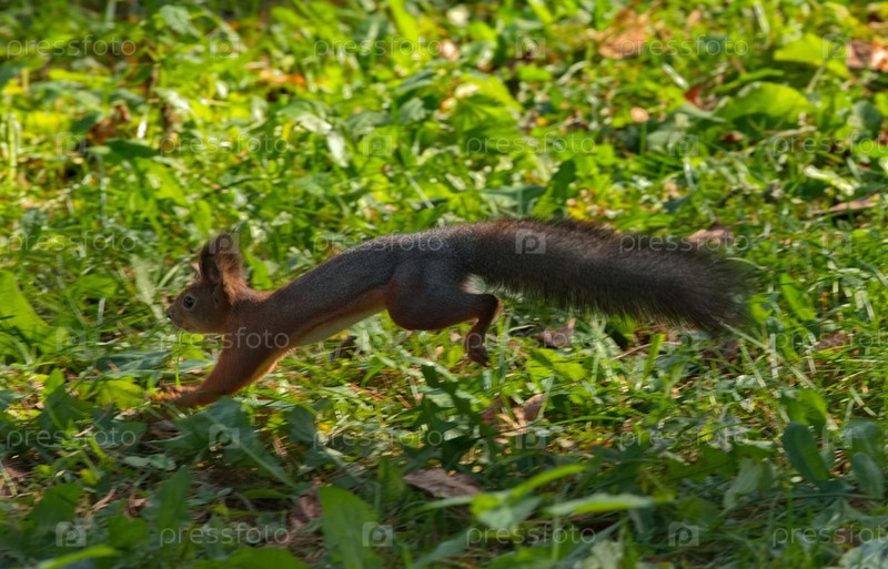 Красная белка в парке Зенково бегает по траве между соснами