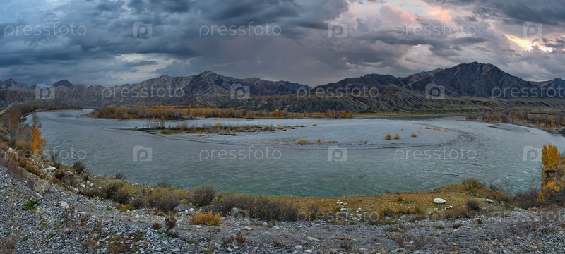Западная Сибирь, Алтайские горы. живописный осенний вид на долину реки Катун возле деревни Инеген