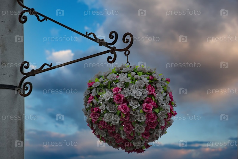 Уличное украшение на светильнике в форме цветочного шара на фоне заходящего неба