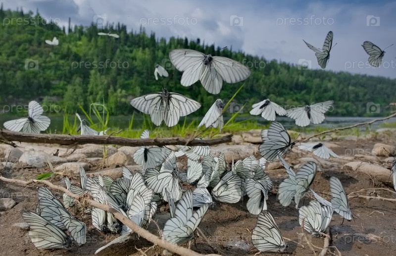 Огромное скопление бабочек на берегу реки Том в начале жаркого лета