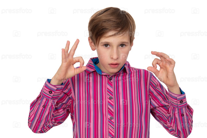 Подросток на белом фоне показывает круг пальцами.Он смотрит в камеру