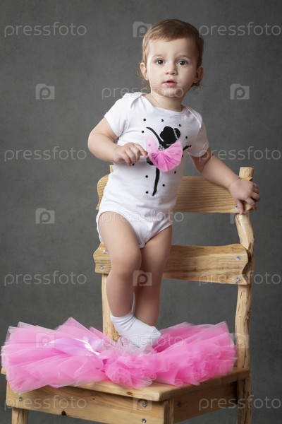 Вертикальный портрет маленькой девочки в розовом балетном туту на сером фоне