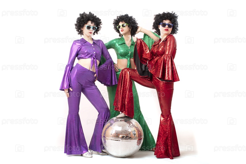 Три поп-звезды в неоновых одеждах позируют перед серебряным шаром.Женщины носят красочную одежду и солнцезащитные очки восьмидесятых годов