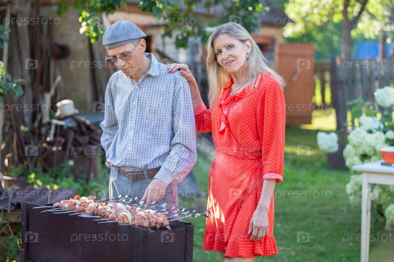 Красивая пожилая пара грилл барбекю на заднем дворе их дома