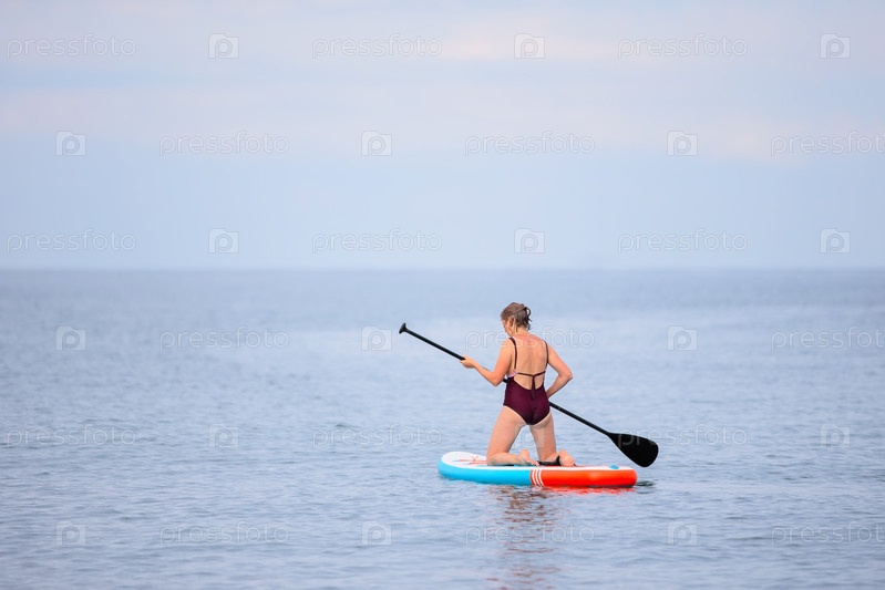 Женщина гребёт доской для серфинга в океане.Вода спокойная, небо ясное