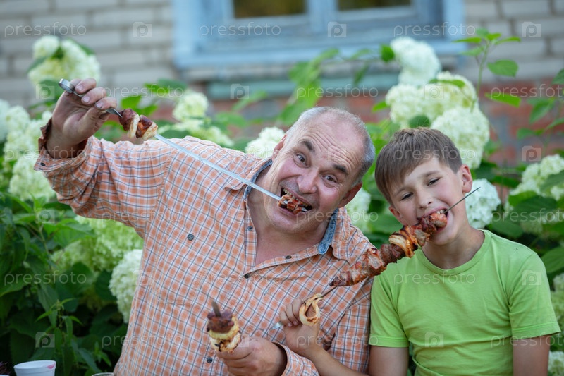 Дедушка и его внук любят есть кебаб и болтать во дворе деревенского дома.Мужчина и мальчик едят вместе и смотрят в камеру
