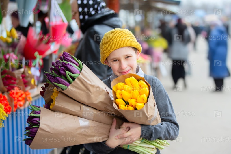 Мальчик держит букет цветов и улыбается.Цветы бывают различного цвета, включая фиолетовый и желтый.Сцена разворачивается на рынке с неузнаваемыми людьми вокруг мальчика