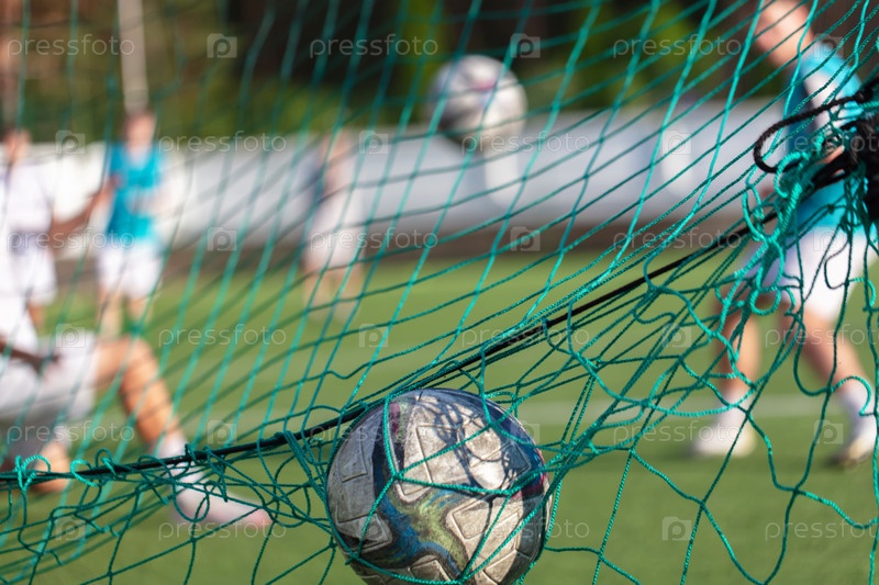 Футбол лежит в сетке на поле с размытыми игроками на заднем плане
