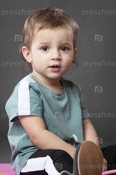 Портрет смешной маленькой девочки, полутора лет, в спортивной рубашке