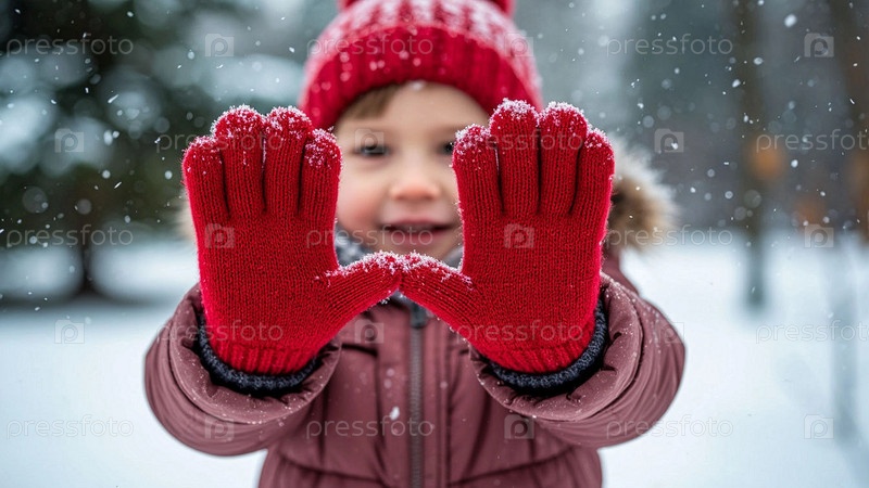Ребенок, носящий красные перчатки в снежном парке или лесу