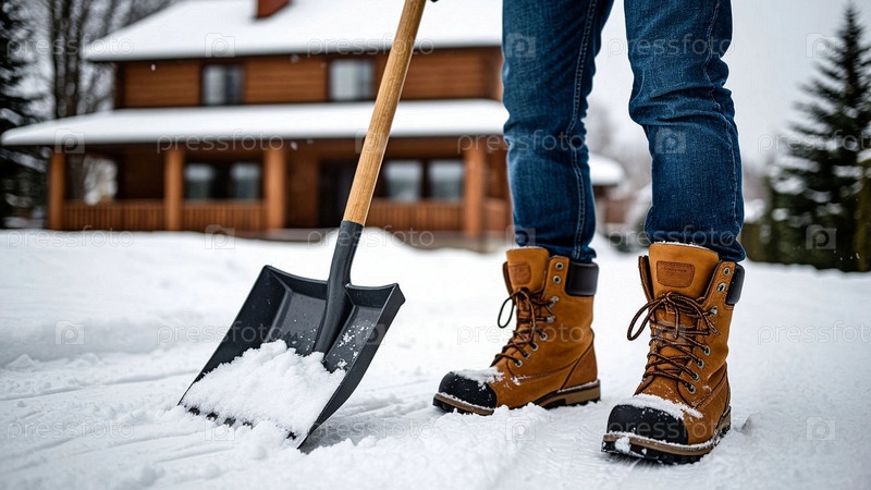 Мужчина очищает территорию от выпавшего снега с помощью большой лопат