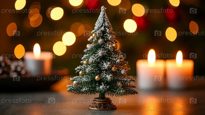 На столе стоит миниатюрная рождественская елка со свечами и конусами