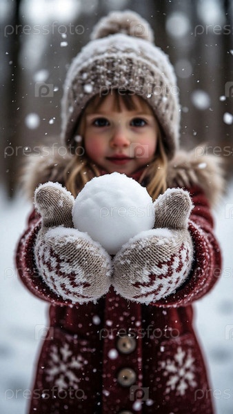Ребенок в перчатках и помпонной шляпе держит круглый снежный шар в руках на фоне зимнего парка и падающего снега