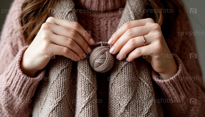Женщина держит в руках пузырь шерстяных нитей, ее шарф соединён с этой пряжей и шерстный свитер