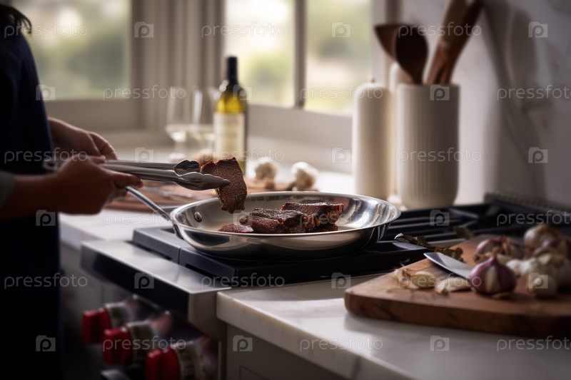 Женщина жаря говядину на сковороде, уютная домашняя кухня с естественным светом