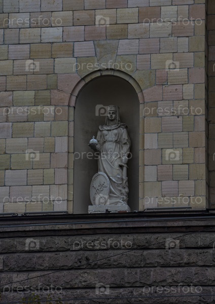Скульптура женщины с силой и мечом в руках, со щитом с символом кадуцея у ее ног