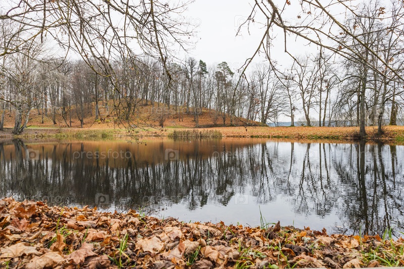Спокойный пруд с упавшими листьями и голыми деревьями, отражающимися в воде, тихий лесной парк