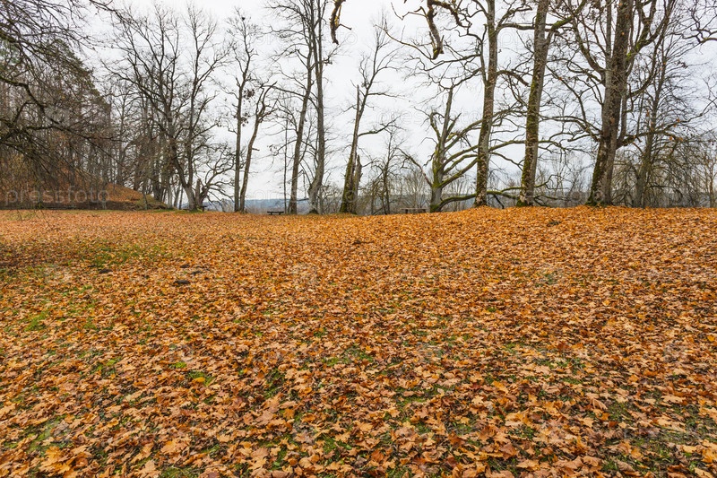 Ковер из сухих золотых листьев под высокими листопадными деревьями в тихом парке
