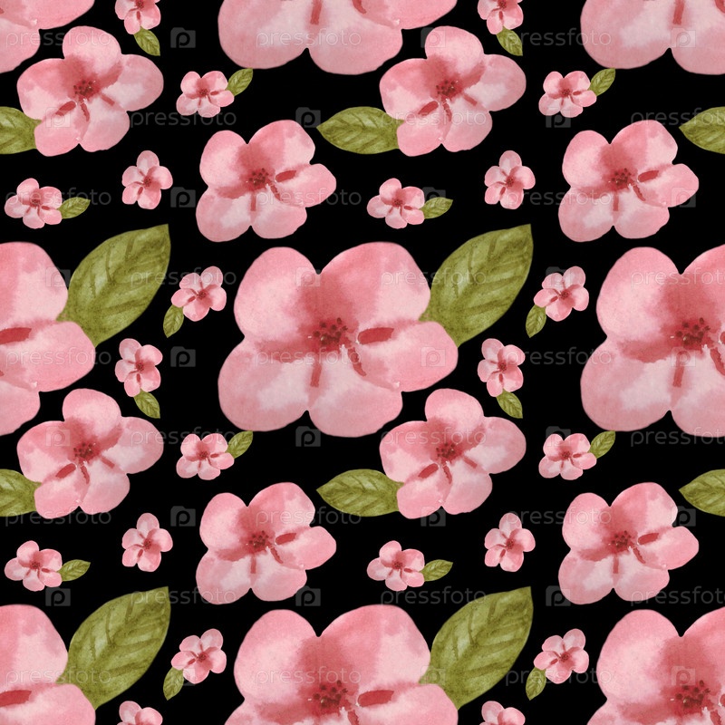 Бесшовный рисунок с розовыми цветами вишневых цветов и листьями на черном фоне. Иллюстрация написана вручную акварелью. Может использоваться на ткани, обложках, упаковочной бумаге, для скапбукинга