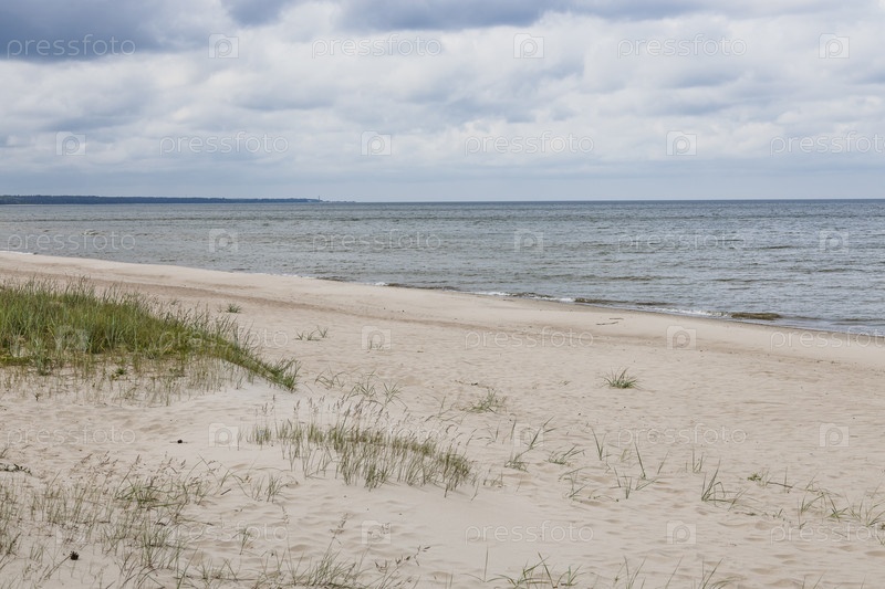 Серия Балтийское море побережье с гладким песком, дюнной травой и мягкими волнами под облачным небом