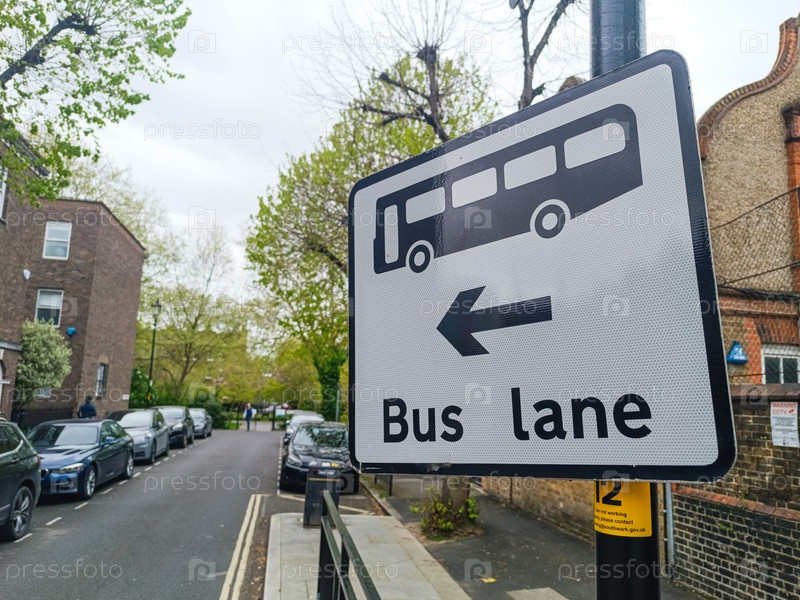 Знак автобусной полосы с левой стрелкой на городской улице, подчеркивающий регулирование движения и приоритет общественного транспорта в городском районе