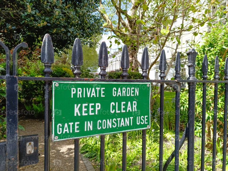 Зеленый знак частного сада на воротах из кованого железа, призывающий держать их в чистоте и указывая, что ворота постоянно используются у входа к жилому помещению с лиственницей
