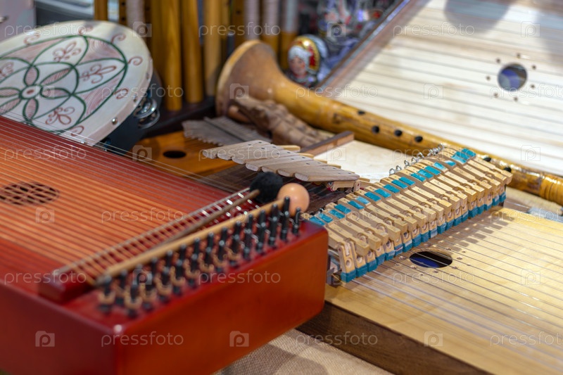 Диапазон традиционных древних музыкальных инструментов, представленных вместе, включает струнные, ударные и духовые народные инструменты