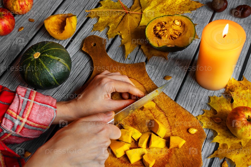 Женщины руками режут тыкву на деревянной доске в окружении осенних листьев, яблок, свечей и сезонных украшений, символизирующих подготовку к Дню благодарения