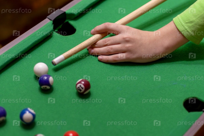 Рука подростка держит значок с палкой, нацеливая бильярдные мячи на зеленый стол для бильярда
