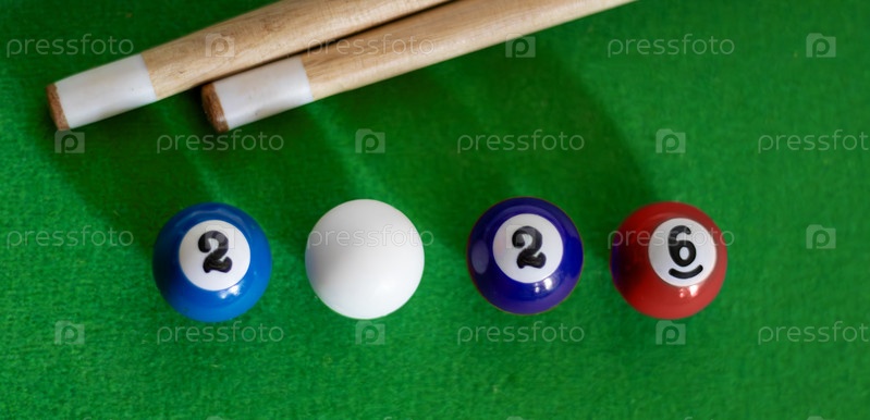 2026 цифры из чисел на бильярдных шарах рядом с сигналами на зеленом столе
