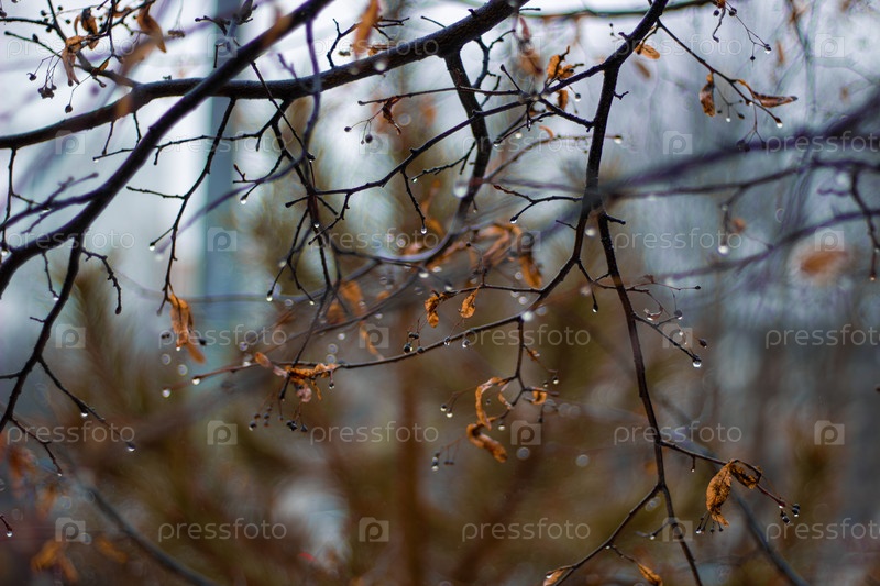Капли дождя на обнаженных ветвях с остатками осенних листьев. депрессивный сезон перехода природы от осени к зиме