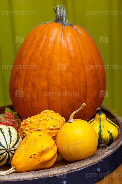 Красочный осенний натюрморт с большим тыквом и разнообразными тыквами, выставленный на деревянной бочке