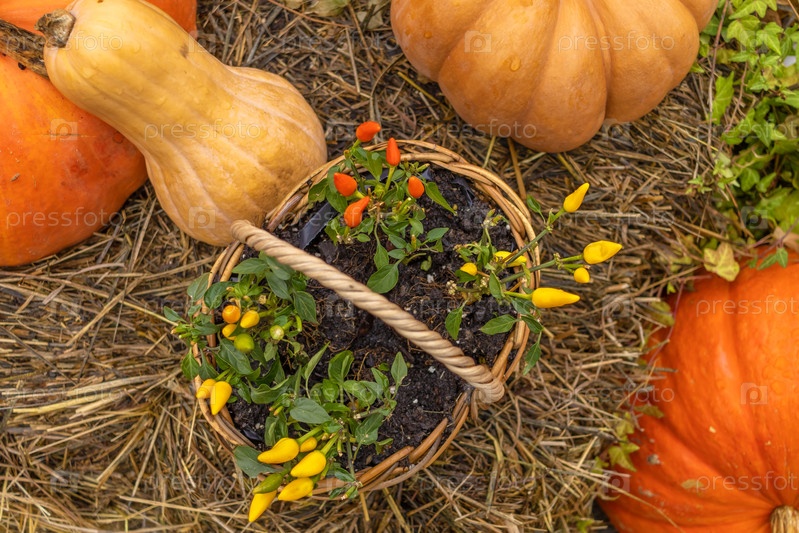 Различные сорта тыквы и сквоша в колючей корзине демонстрируют сущность осеннего урожая