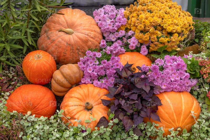 Яркий дисплей тыквен и красочных цветов, символизирующих осень