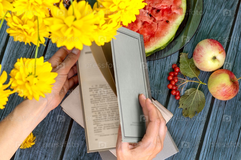 Руки переворачивают книгу возле стола, украшенного желтыми цветами, яблоками, арбузом и красными ягодами