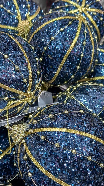 Завершая блестящие голубые рождественские дамы, украшенные золотыми бусинками и искрящимися на прилавке магазина, создавая праздничный праздничный фон